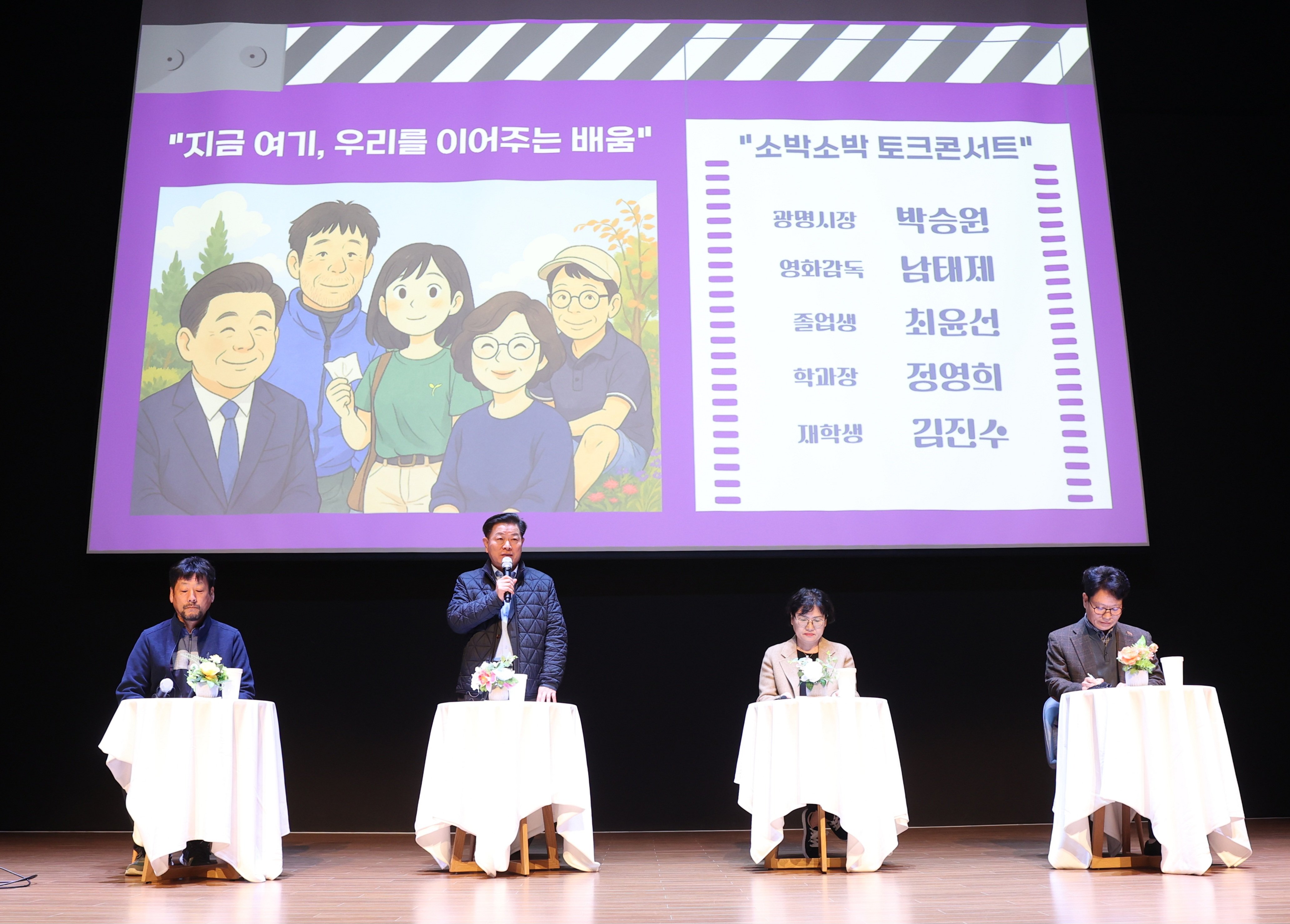 이날은 다큐멘터리 영화 ‘바로 지금 여기’ 관람 후, 남태제 감독, 박승원 광명시장, 기후에너지학과 3기 졸업생 최윤선, 마을공동체학과장 정영희, 정원도시학과 재학생 대표 김진수가 참여한 미니 토크콘서트로 이어졌다.