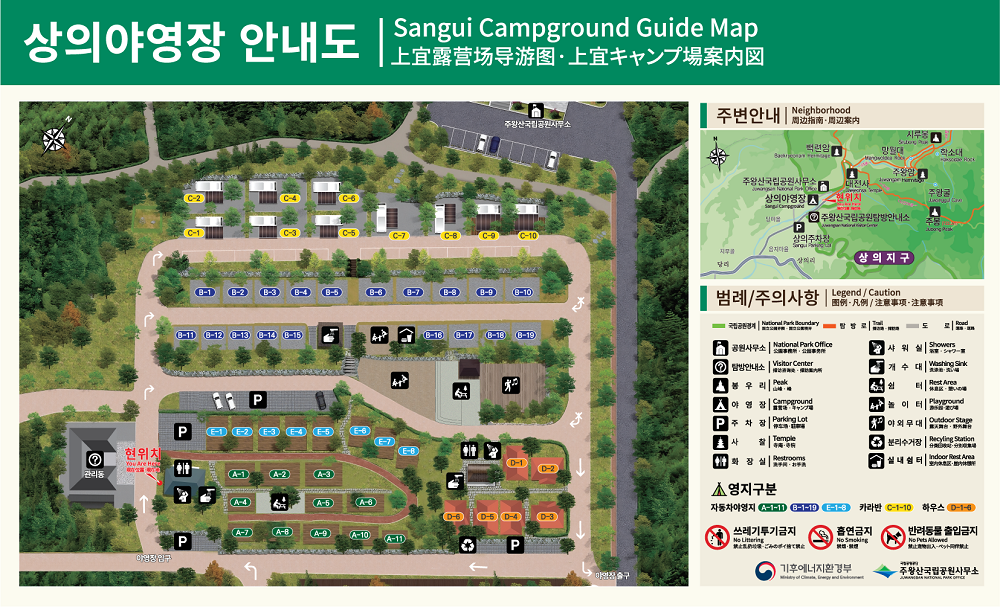 상의야영장은 하우스(6), 카라반(10), 자동차영지(19), 복층형영지(8), 데크영지(11) 총 54동으로, 영지수를 줄이고 영지면적을 확장하여 다양한 캠핑스타일에 대응할 수 있는 타입을 구성하여 가족, 연인, 소규모 모임 등 다양한 니즈를 충족할 수 있도록 영지를 조성하였다.