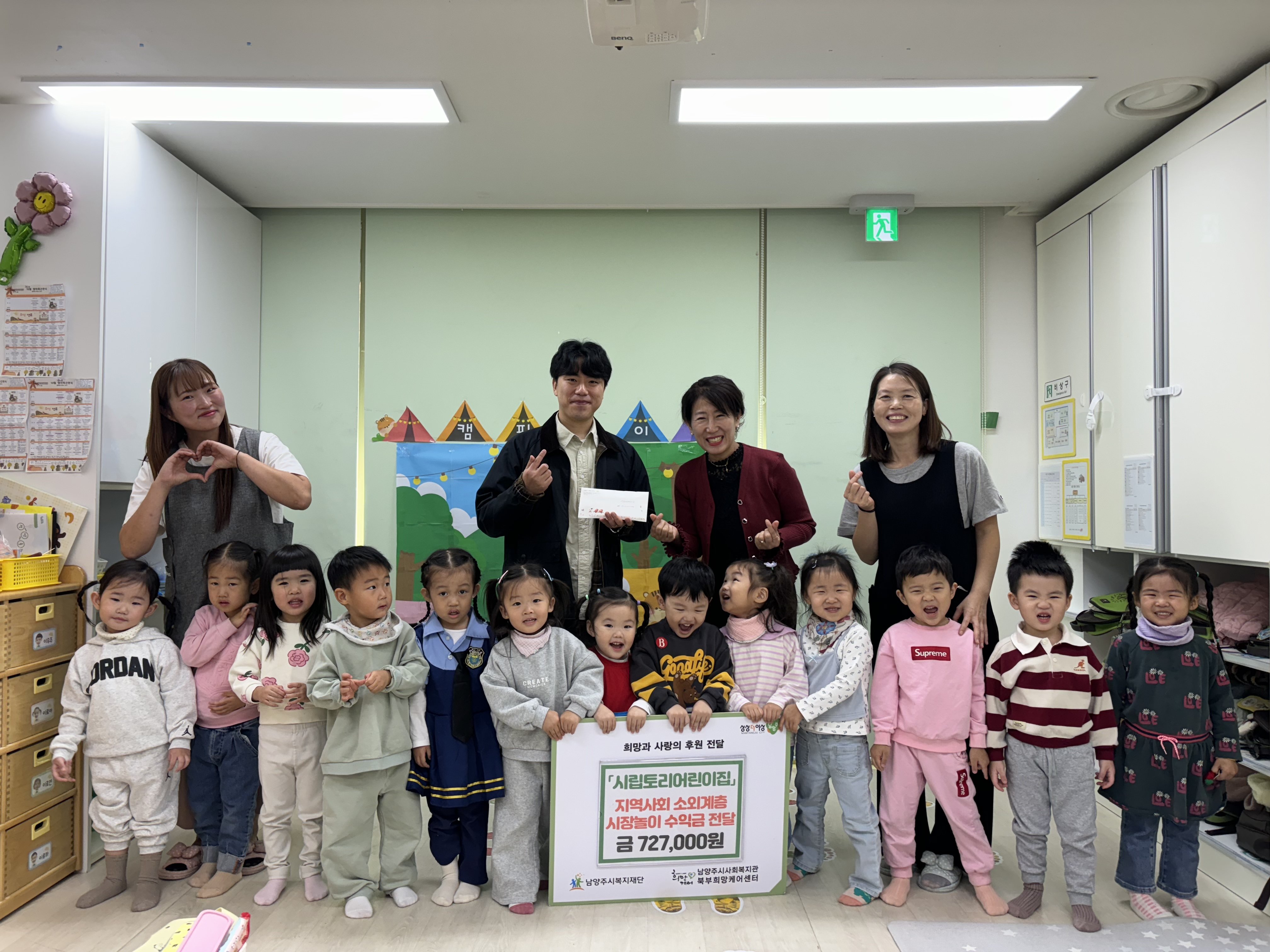 [금요저널] 남양주시는 지난 29일 별내동 소재 시립토리어린이집이 원아들과 학부모, 교직원이 함께 마련한 후원금 72만 7천 원을 남양주시사회복지관 북부희망케어센터에 전달했다고 밝혔다.