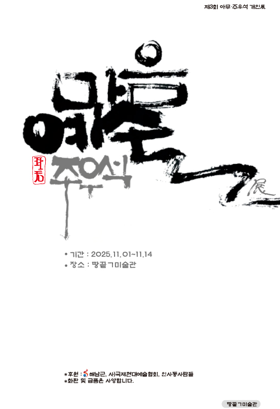 구상과 비구상의 경계를 넘나들며 철학, 사상, 생각 등의 인간 내면의 세계를 표현한 창작품으로 예술 활동을 펼치는 주우석 작가는 2025년 11월 1일(토) ~ 11월 14일(금)까지 해남군 땅끝ㄱ미술관에서 "마음예술" 타이틀로 개인전을 실시 중에 있다.
