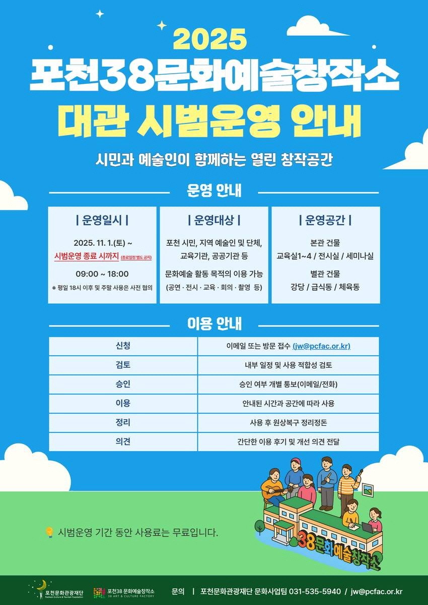 이중효 포천문화관광재단 대표이사는 “이번 시범운영은 시민과 예술인이 보다 쉽게 창작소 공간을 활용할 수 있도록 운영체계를 사전에 점검하고 보완하는 과정”이라며 “이용자 의견을 폭넓게 반영해 포천38문화예술창작소가 지역 문화예술의 중심지로 자리매김할 수 있도록 노력하겠다”고 밝혔다.