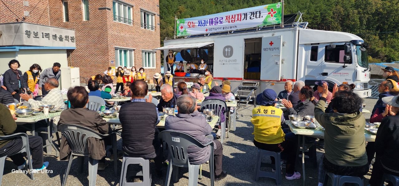 [금요저널] 대한적십자봉사회 울진군지회(회장 원명순)가 11월 3일 기성면 황보1리 마을회관에서 ‘오지마을 찾아가는 밥차’봉사활동을 펼쳤다.