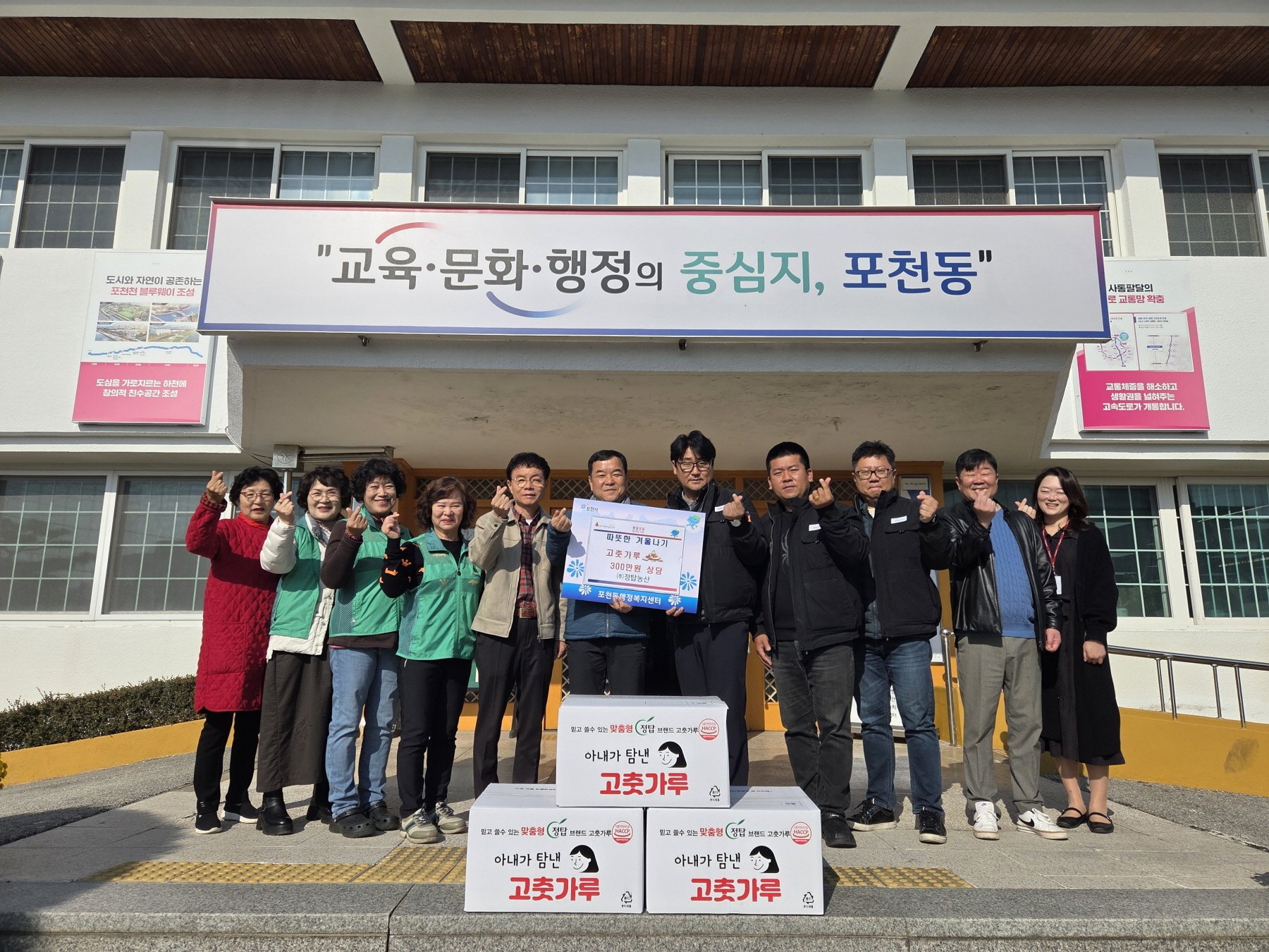 [금요저널] 포천동 행정복지센터는 지난 4일 관내 기업 ㈜정탑농산이 ‘2025년 사랑의 김장나누기’행사를 위해 포천동 단체장협의회에 300만원 상당의 고춧가루를 기부했다고 밝혔다.