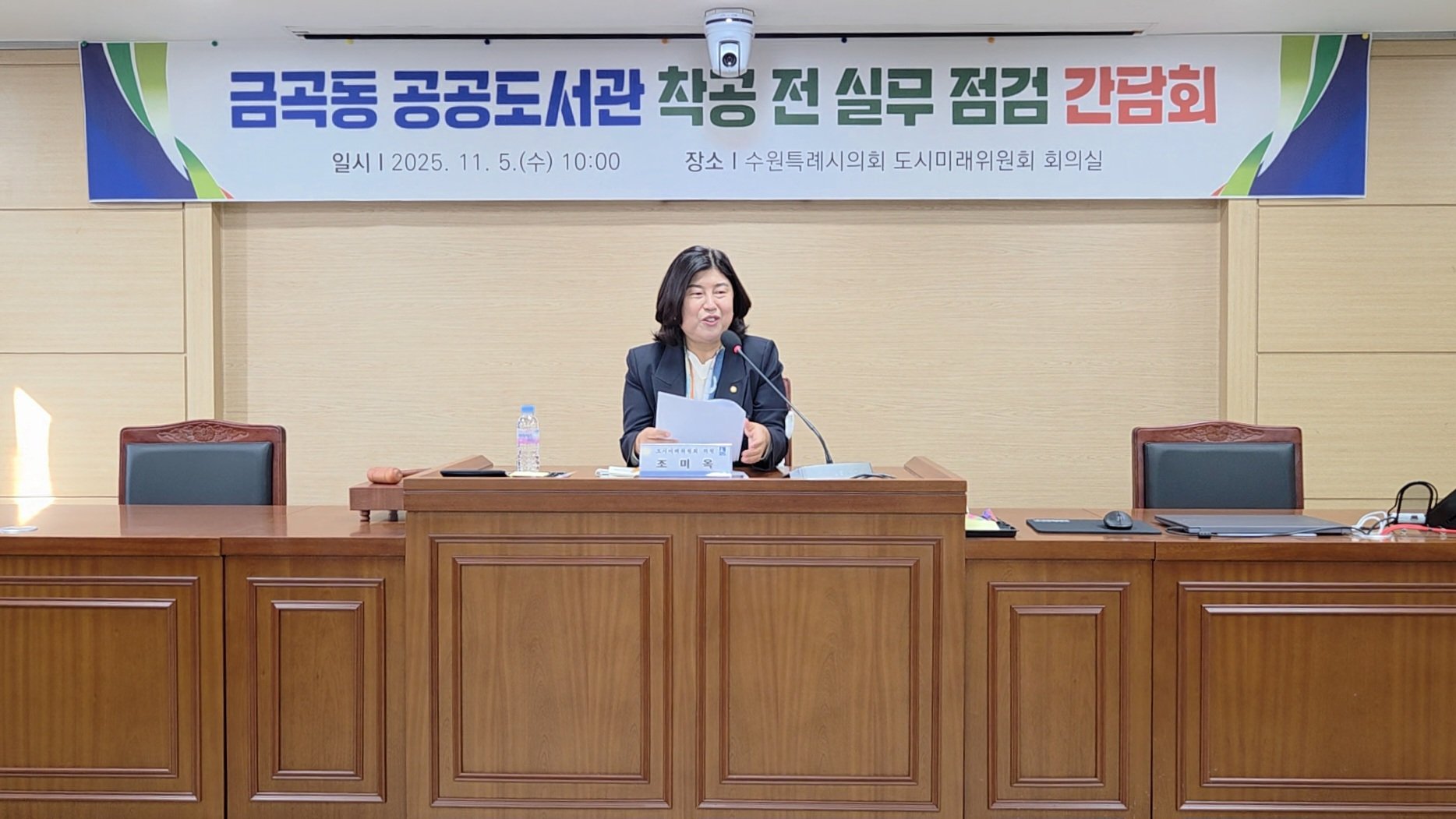[금요저널] 수원특례시의회 도시미래위원회 조미옥 의원은 금곡동 공공도서관 착공을 앞두고 도서관사업소·시설공사과 등 관련 부서가 참석한 가운데 사전 점검 간담회를 주재했다.