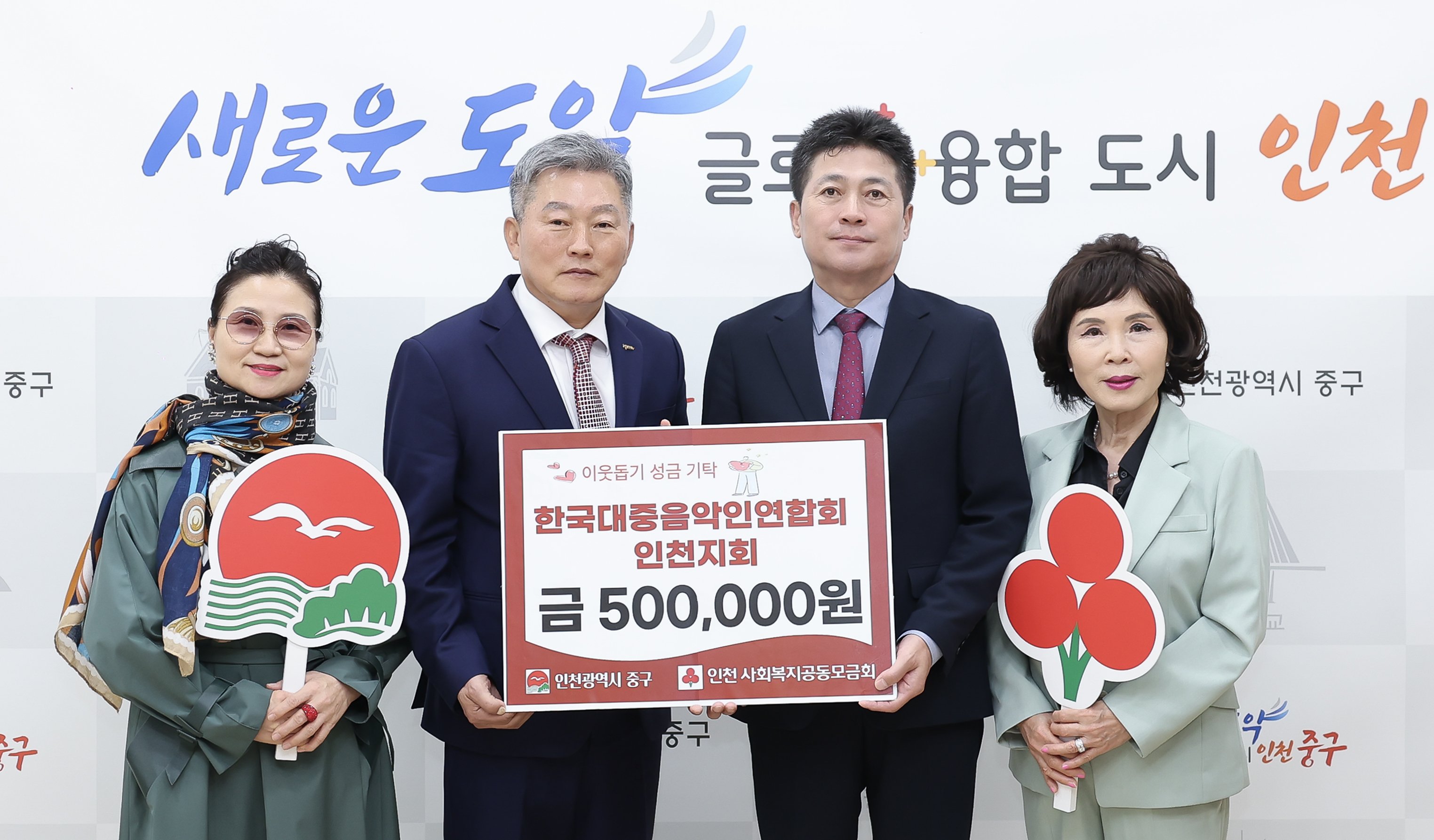 [금요저널] 인천시 중구는 최근 사단법인 한국대중음악인연합회 인천지회가 월미도 자선 공연을 통해 마련된 수익금 50만원을 기탁했다고 6일 밝혔다.