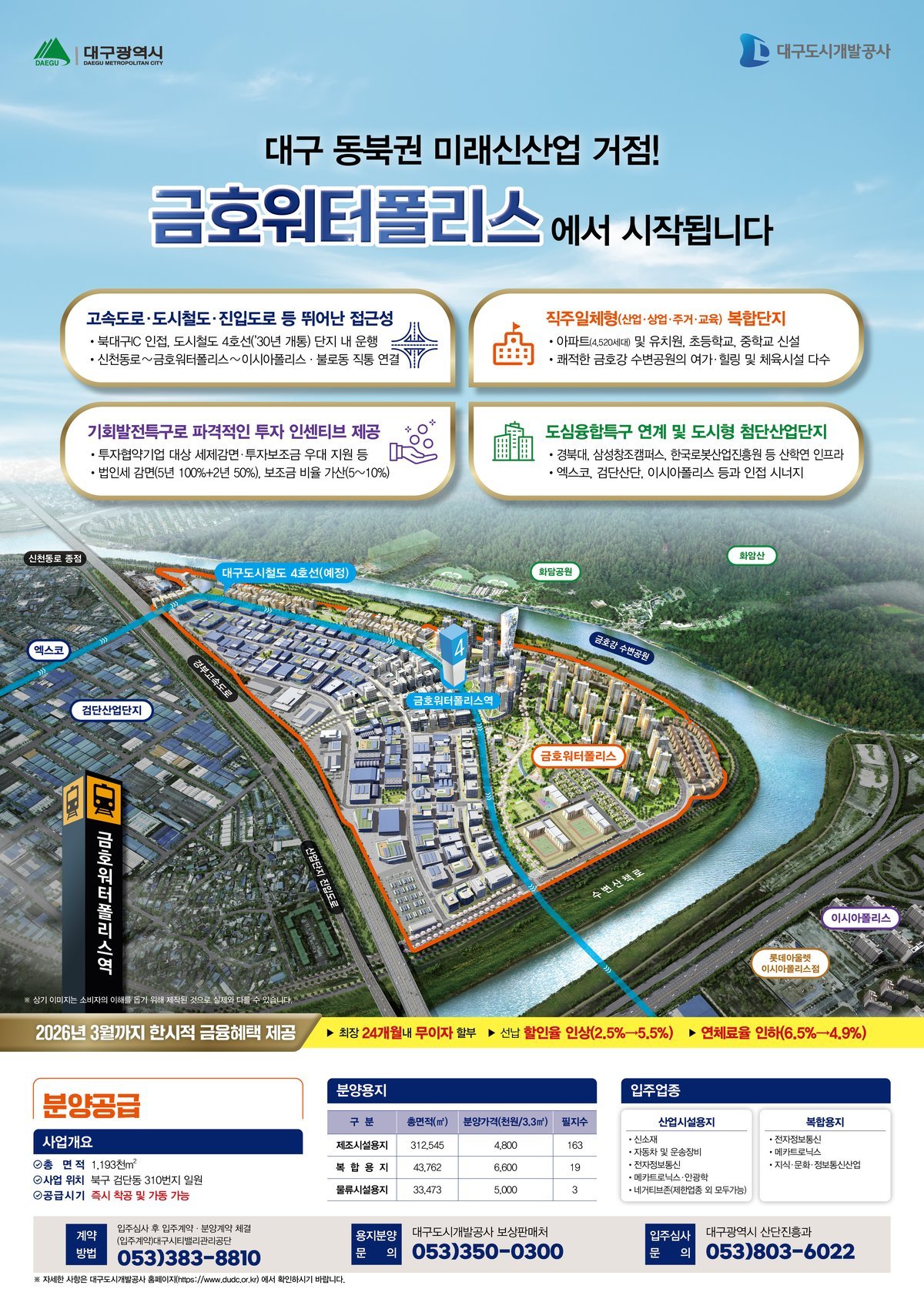 [금요저널] 대구광역시는 미래 첨단산업 육성의 동북권 클러스터 거점인 율하도시첨단산업단지와 금호워터폴리스에 대한 분양설명회 개최에 이어 이달 4일 공급공고를 시작으로 본격적인 분양에 돌입했다.
