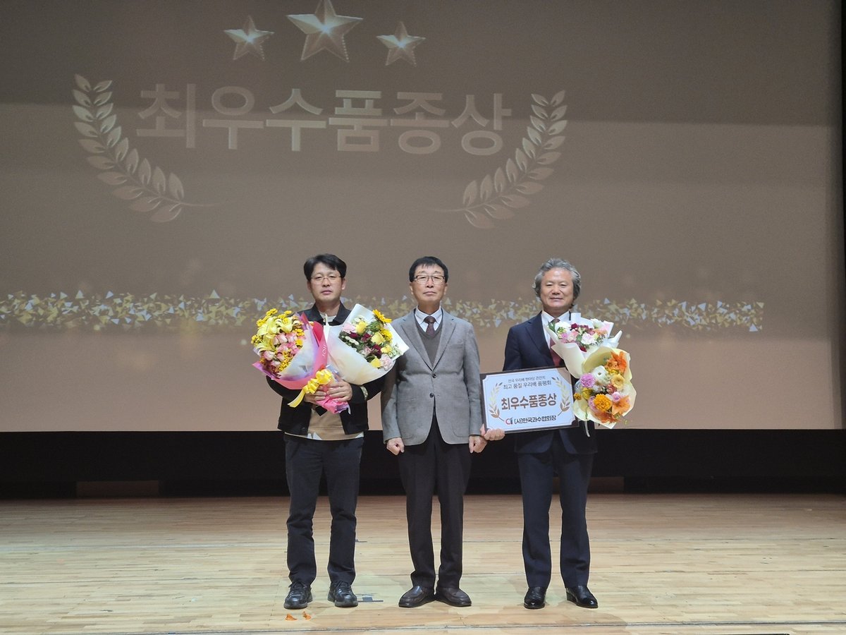 나주목사골농장 정진채 대표 오른쪽 가 지난 7일 열린 제21회 전국 우리배 한마당 큰잔치 품평회 에서 최우수품종상 을 수상했다 (나주시 제공)