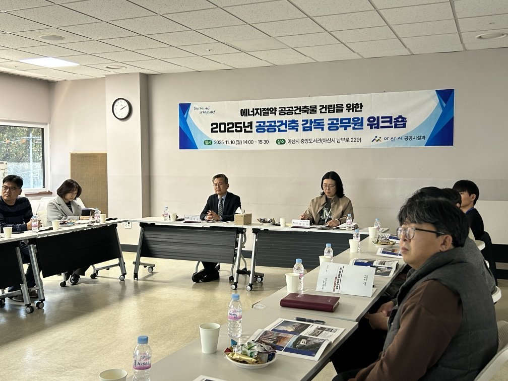 [금요저널] 아산시는 10일 중앙도서관에서 공공건축 감독 공무원들을 대상으로 ‘에너지 절약 및 친환경 공공건축물 건립 실무교육 워크숍’을 열었다.