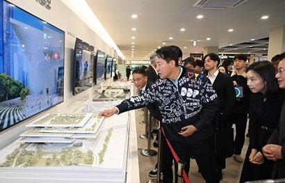 오세훈 서울시장이 10일(월) 종로구 세종문화회관에서 열린 '제2세종문화회관 건립 설계공모 시상식'에서 설계안 당선작을 살펴보고 있다.