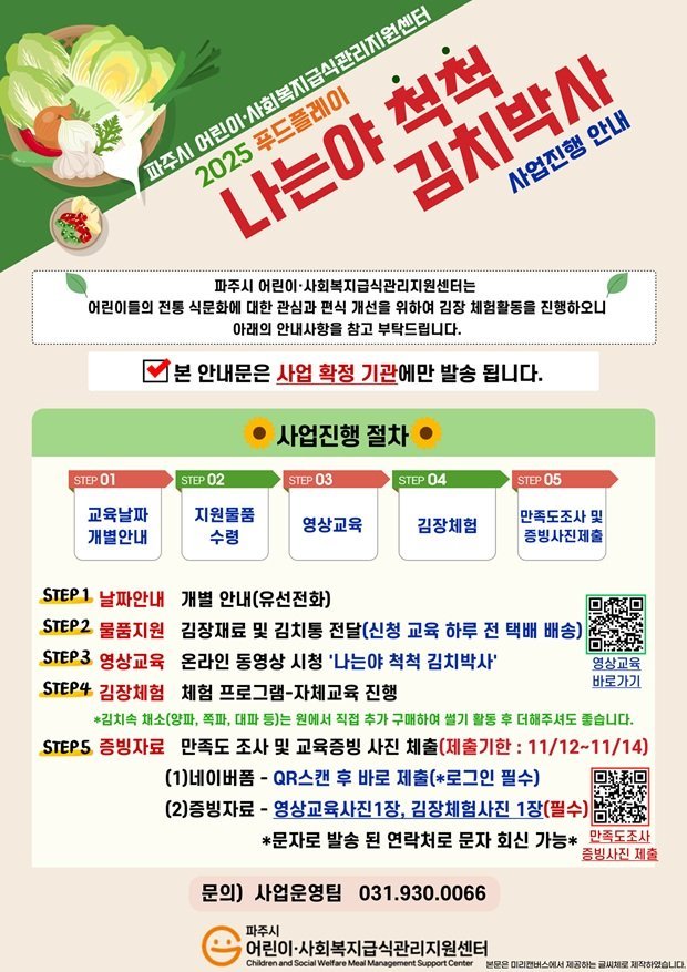 파주시 어린이 사회복지급식관리지원센터 어린이 김장 체험 활동 나는야 척척 김치 박사 운영 포스터