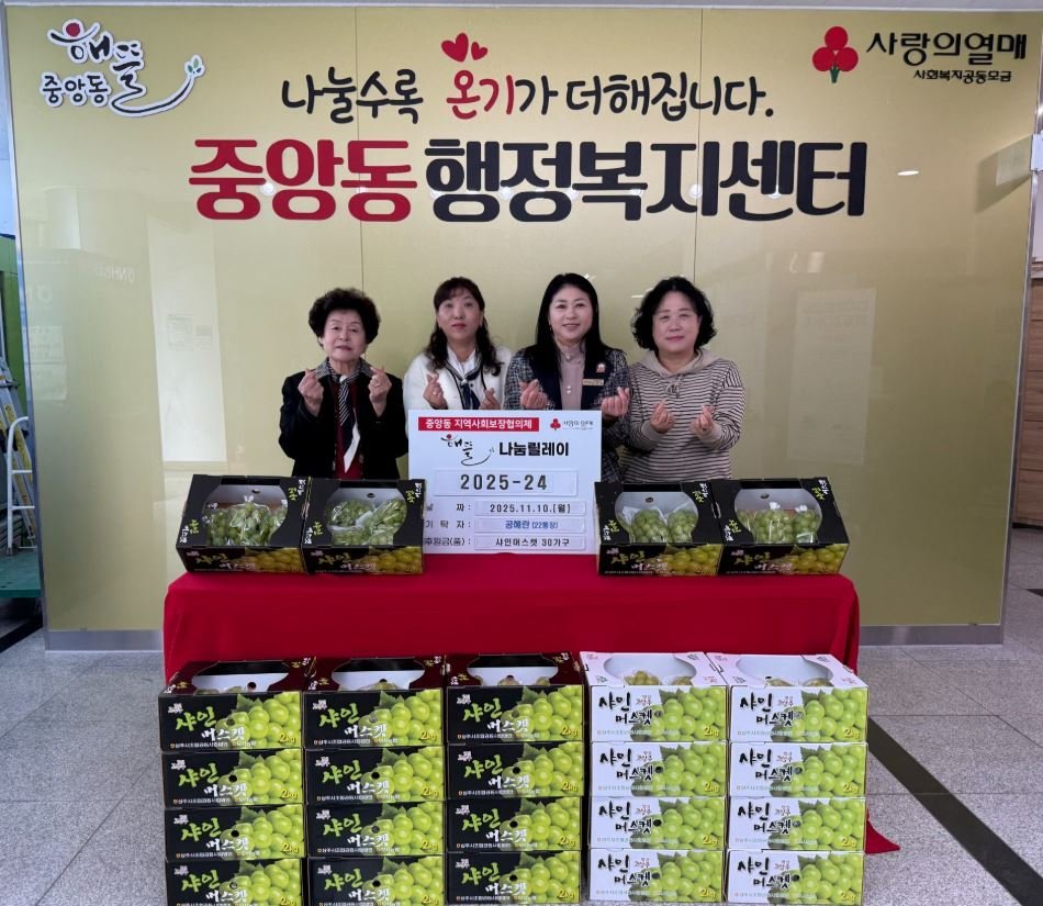 이에 대해 백경희 중앙동장은 “항상 지역의 이웃들을 위해 따뜻한 마음을 전해주시는 공혜란 지점장님께 감사드린다”며 “기탁해주신 샤인머스캣은 저소득 한부모가정 등 취약계층에게 소중하게 전달하겠다”고 밝혔다.