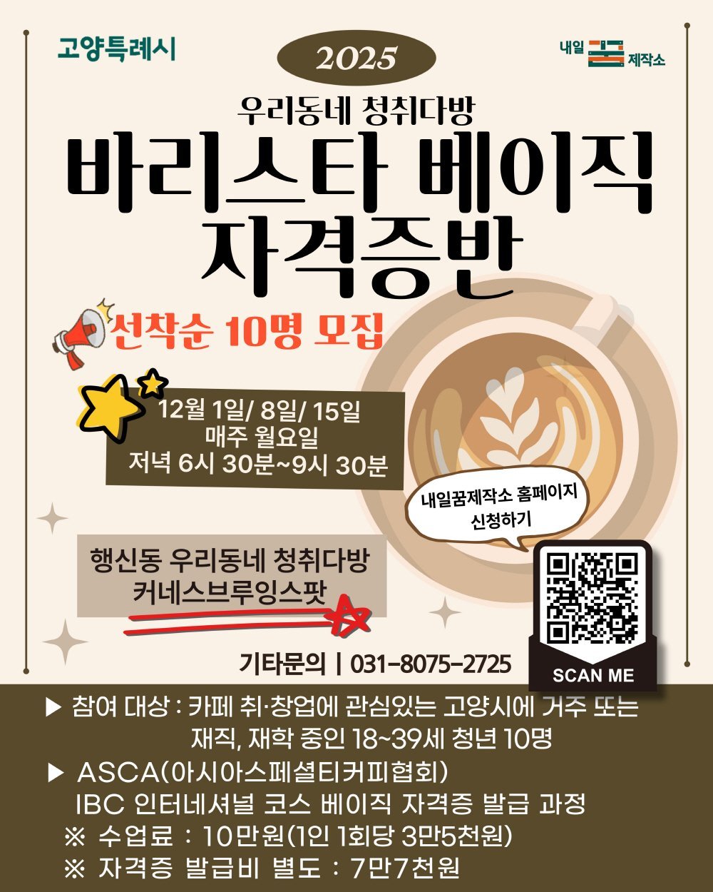 고양시청년공간 내일꿈제작소 와 함께하는 바리스타 베이직 자격증반 수강생 모집