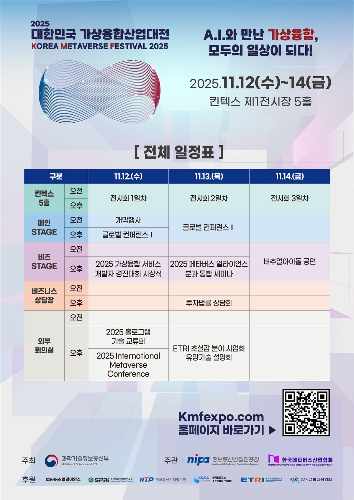 11월 12일에는 개막행사와 ‘글로벌 컨퍼런스Ⅰ,’ ‘가상융합서비스 개발자 경진대회 시상식,’ ‘홀로그램 기술교류회’와 ‘2025 International Metaverse Conference’가 열리며, 11월 13일에는 ‘글로벌 컨퍼런스Ⅱ’와 ‘메타버스 얼라이언스 분과통합 세미나,’ ‘기업 대상 투자법률 상담회,’ ‘초실감 유망기술 설명회’가, 11월 14일에는 버추얼 아이돌 RapidEye의 공연이 열린다.