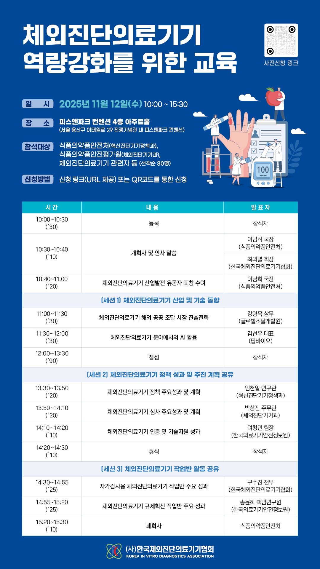 [금요저널] 식품의약품안전처는 체외진단의료기기의 최신 기술개발 동향을 공유하고 현장의 의견을 청취하기 위해 ‘체외진단의료기기 역량 강화 교육 및 간담회’를 11월12일 서울 피스앤파크컨벤션에서 개최한다고 밝혔다.