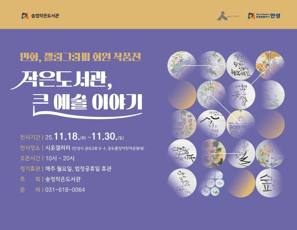 [금요저널] 안성천 공도 작은미술관 시옷갤러리에서는 오는 11월 18일부터 30일까 지 송정작은도서관의 지역 주민으로 구성된 민화 캘리그라피 회원들의 작품을 모은 전시회 ‘작은도서관, 큰 예술 이야기’가 열린다.