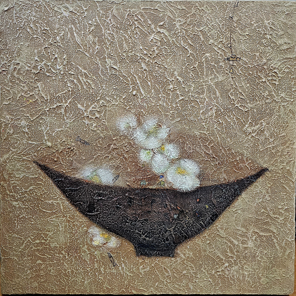 색과 선이 스며드는 자리마다 내면의 결과 감정의 숨결이 남아 있으며, 화폭 위 여백과 번짐 그리고 절제된 색채는 자신과 마주하는 시간을 이야기 한다. 팝콘처럼 활짝 핀 하얀 차 꽃 중심에 노란 꽃술을 잔잔하게 그려 찻잔에 내려놓듯 구성하였다.