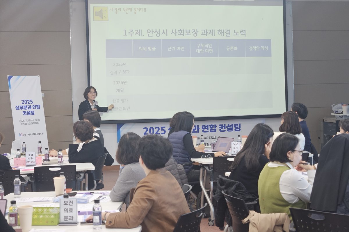 [금요저널] 지난 12일 안성시지역사회보장협의체 7개 실무분과 위원을 대상으로 2026년 운영계획을 수립하기 위한 연합컨설팅을 실시하였다. 이번 컨설팅은 올 한 해의 협의체 운영 전반을 점검하고 실무분과별 사업 추진 성과를 공유하며, 2026년 운영 방향과 핵심과제를 논의하기 위해 마련되었다.