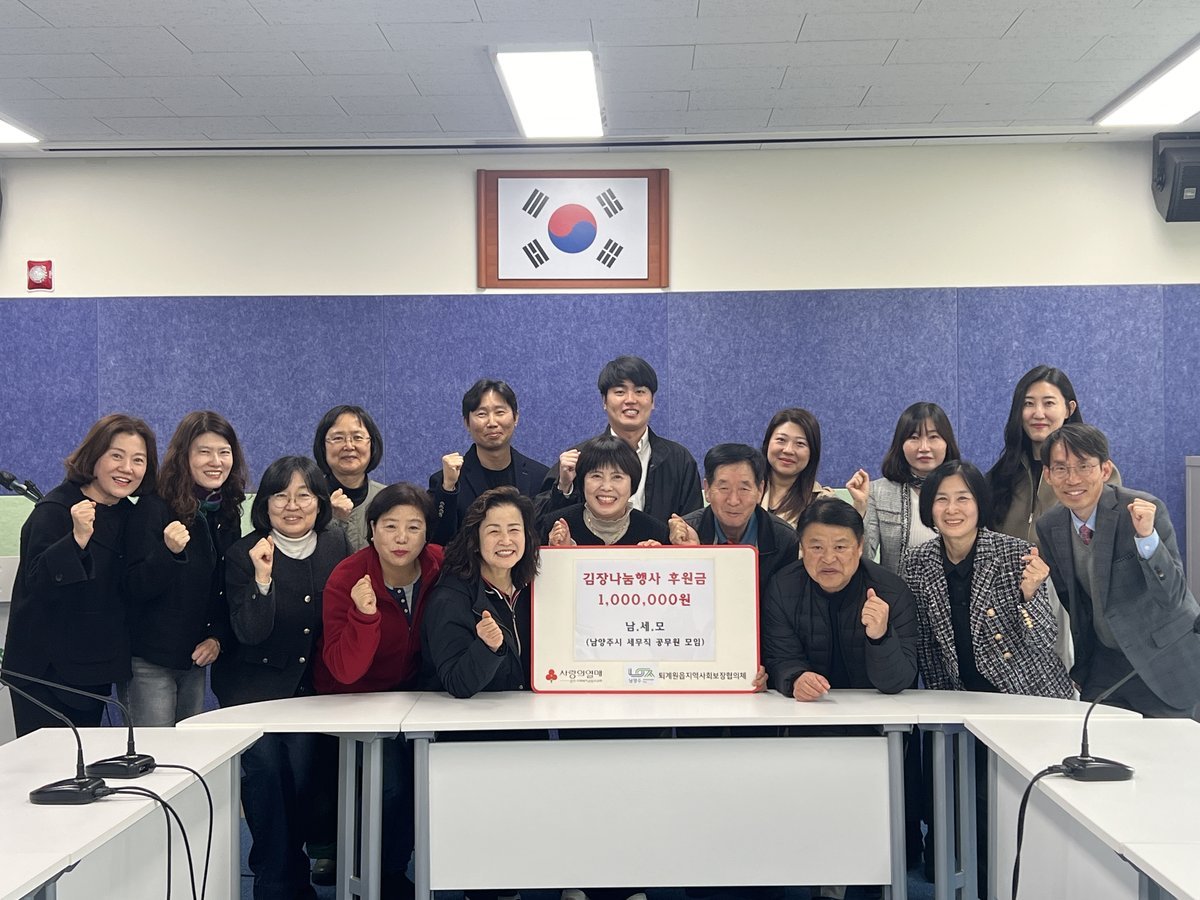 [금요저널] 남양주시는 지난 13일 세무직 공무원 모임 ‘남세모’가 퇴계원읍 사회단체협의회에 김장 나눔 행사 후원금 100만원을 지정 기탁했다고 밝혔다.