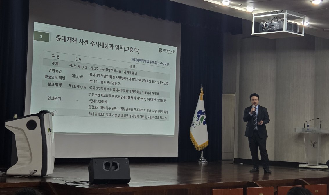 먼저 1차 교육은 ‘중대산업재해예방’을 주제로 이뤄졌으며 법무법인 로얄 소속 변호사가 중대재해 사례를 바탕으로 안전보건 확보 의무와 책임을 강조했다.