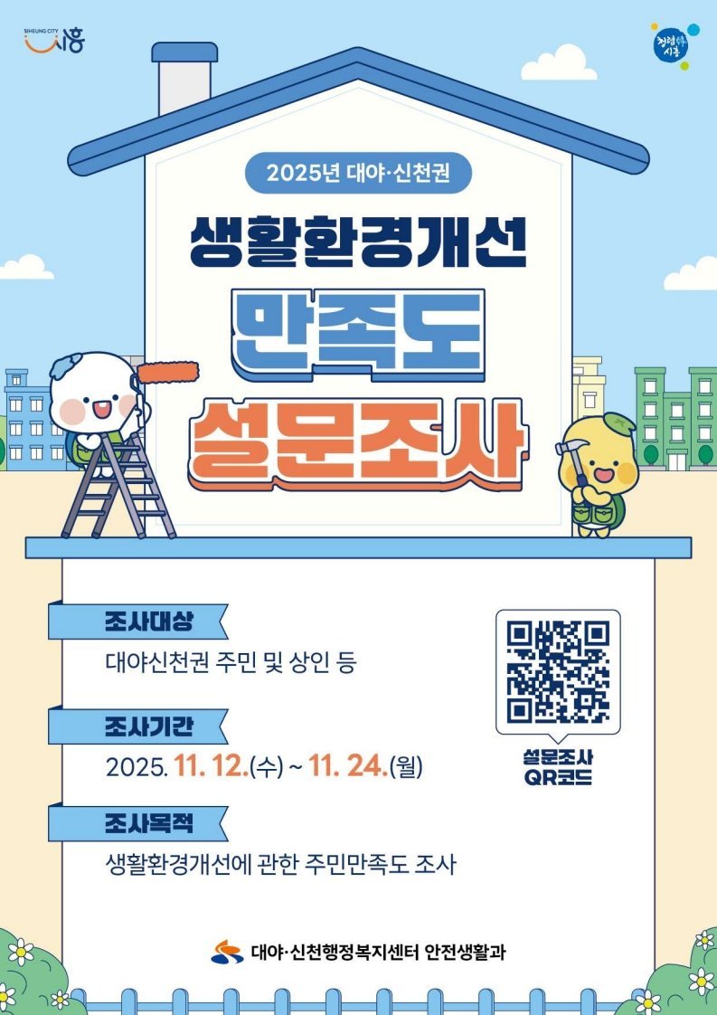 [금요저널] 시흥시 대야ㆍ신천행정복지센터는 대야ㆍ신천권역의 생활환경개선을 위한 주민 만족도 조사를 실시하고 있다. 이번 조사는 안전생활과에서 추진 중인 생활환경개선사업 전반에 대한 주민 의견을 적극 수렴하고, 향후 정책과 사업 개선에 반영하기 위해 마련됐다.
