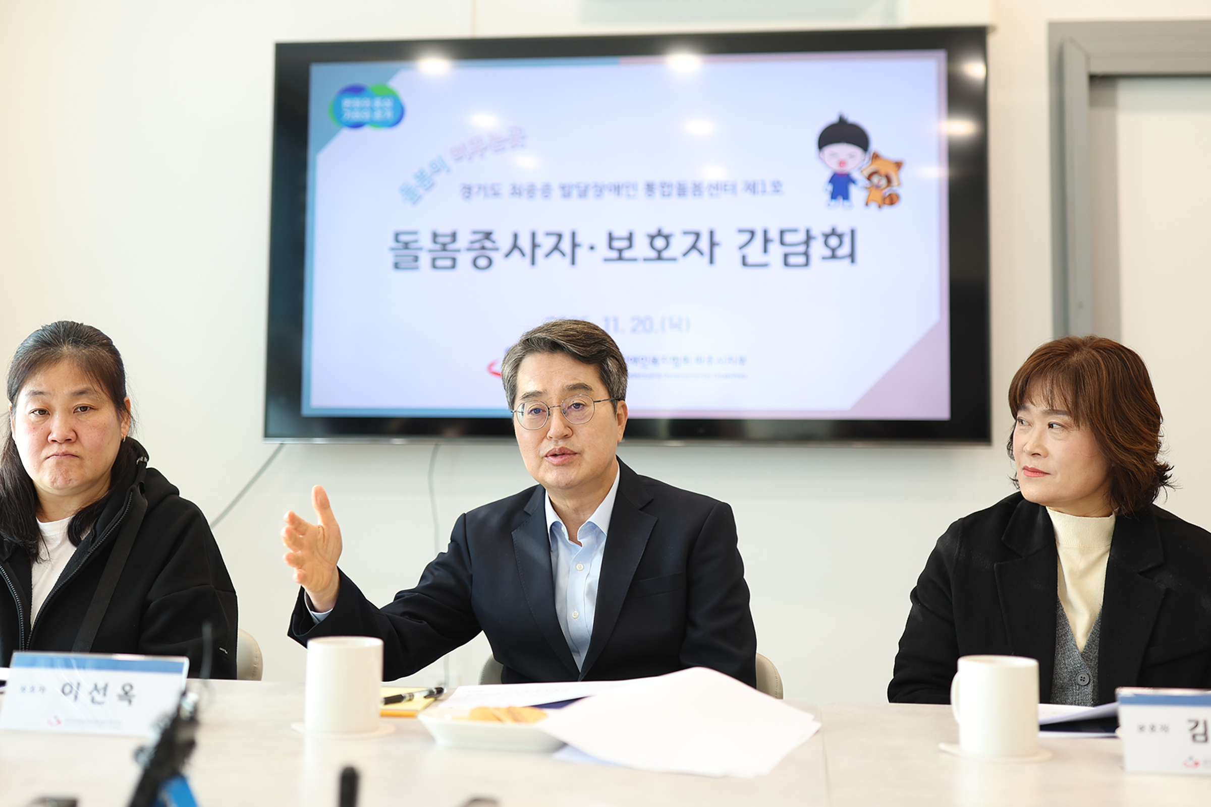 그러면서 “불 끄는 소방대원, 범죄자를 잡는 경찰 등이 다 공공재다. 시혜라고 생각하면 안 되고, 국가가 당연히 해야 할 일이다”며 “(발달장애인 돌봄에)규정을 얘기할 게 아니라 관점을 바꿔야 한다. 불이 났는데 규정을 따져서 불을 끄나. 발달장애인 돌봄 등도 사회 공동의 책임이다. (경기도가) 대한민국 어디보다 가장 앞장서 하겠다”고 강조했다.