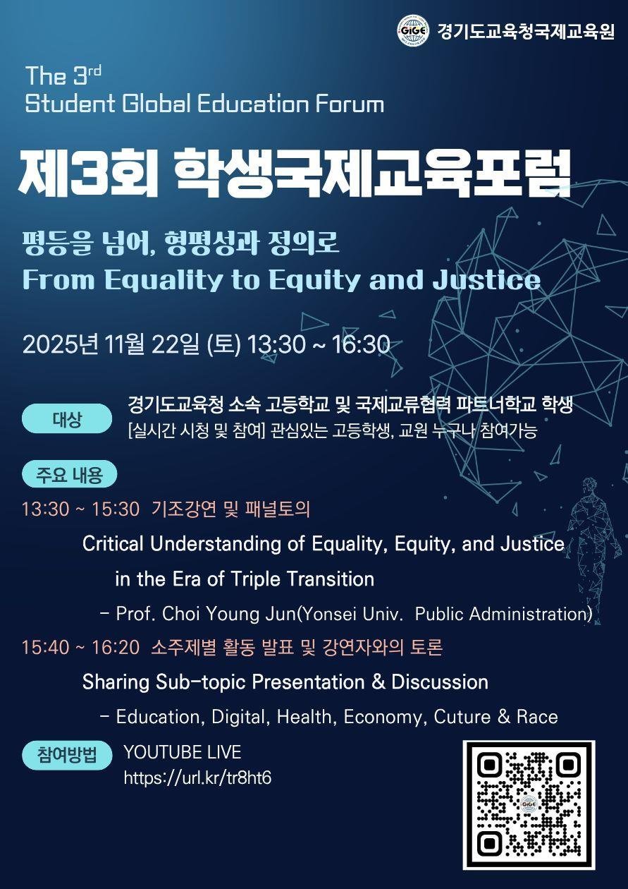올해 ‘학생국제교육포럼’의 주제는 ‘평등을 넘어, 형평성과 정의로’로 참가자들은 교육·디지털·건강·경제·문화와 인종 형평성 등에 대한 문제해결 가능성을 탐색한다.