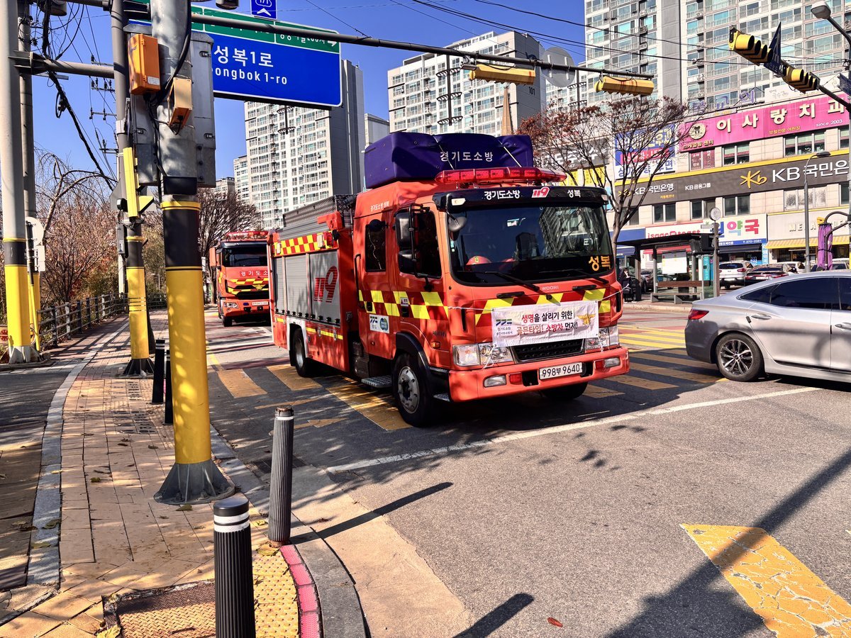 훈련은 성복119안전센터를 출발해 성복동주민센터 사거리, 성복역 방면 등 주요 도로를 중심으로 △소방차 출동 시 양보요령 홍보방송 △교차로·상가 밀집지역 불법 주·정차 차량 확인 △골목길 출동 장애요인 점검 등을 중점적으로 실시했다.