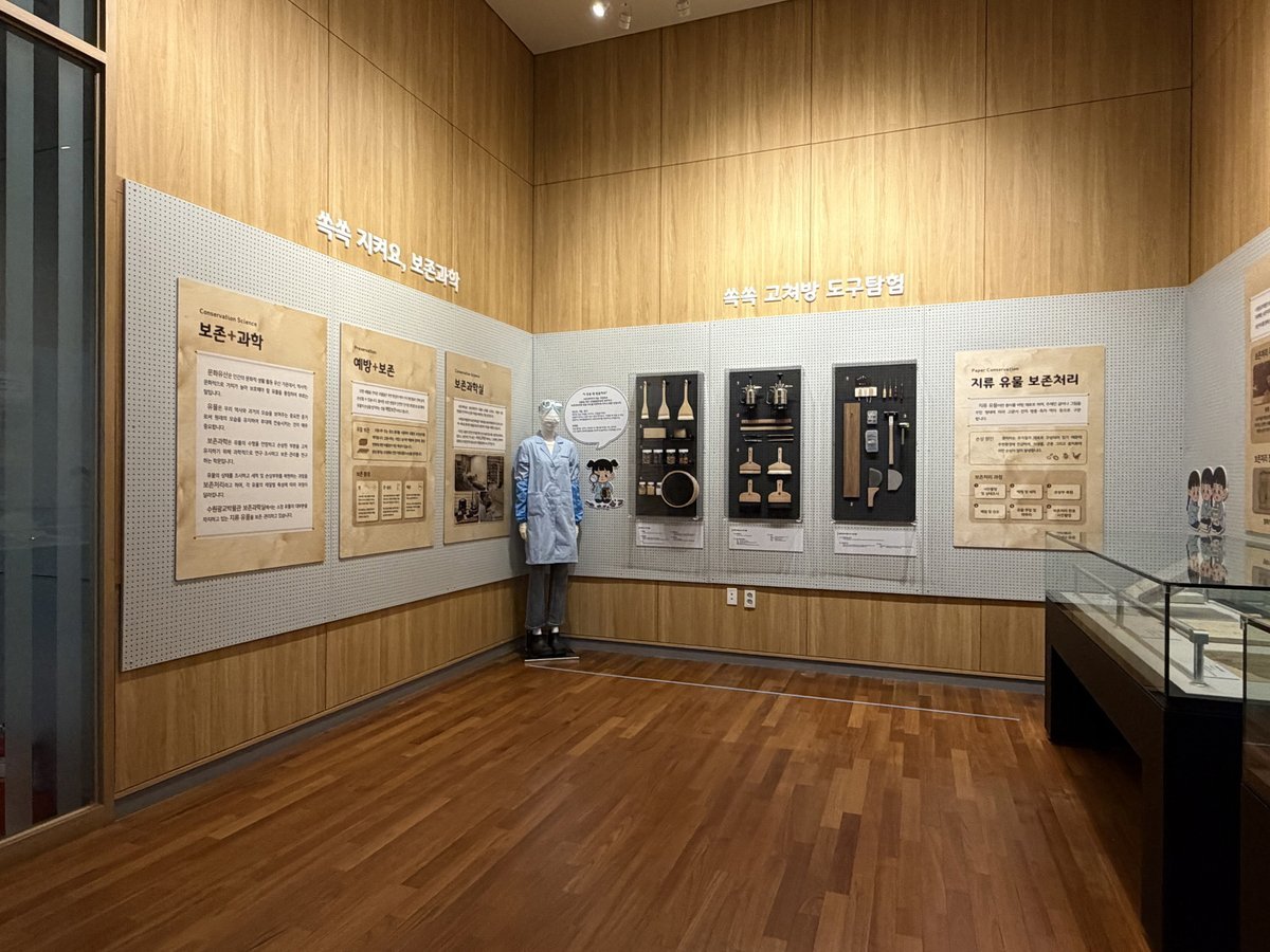 보존 과학자의 역할과 지류 유물 보존 처리 과정을 단계적으로 보여주는 전시다.