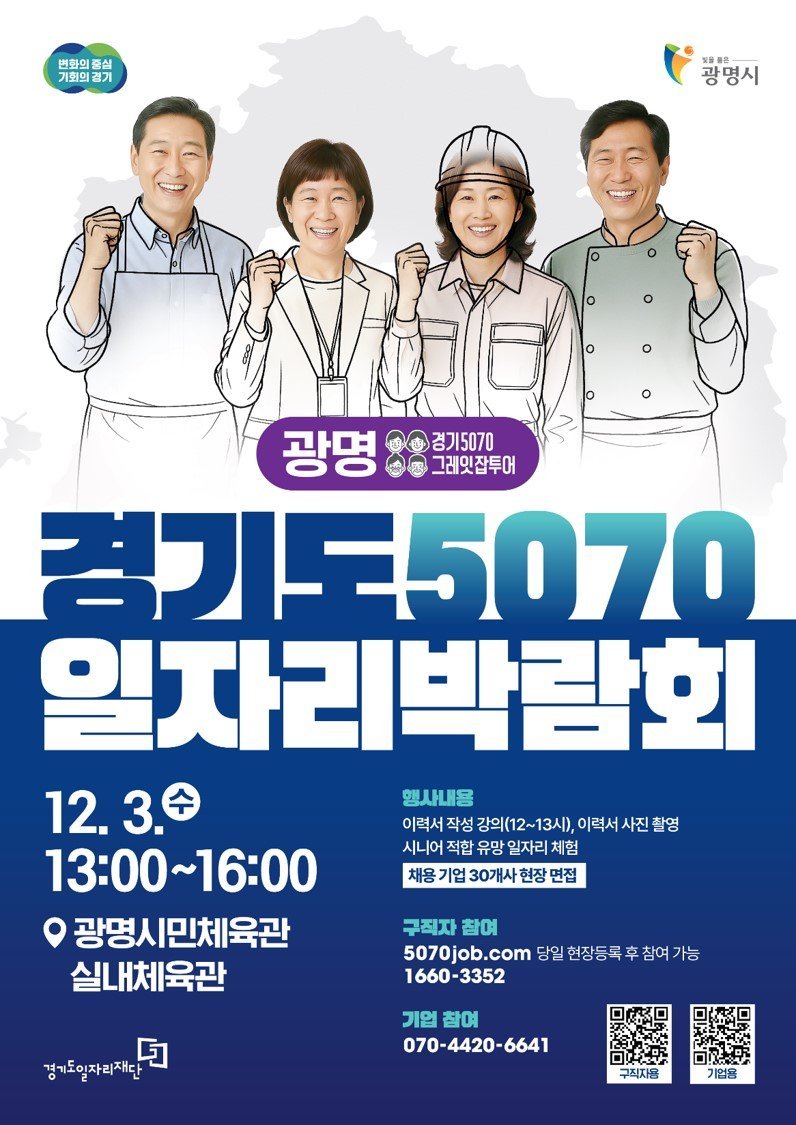 시는 오는 12월 3일 오후 1시 광명시민체육관에서 ‘경기도5070일자리박람회’를 개최한다고 24일 밝혔다.