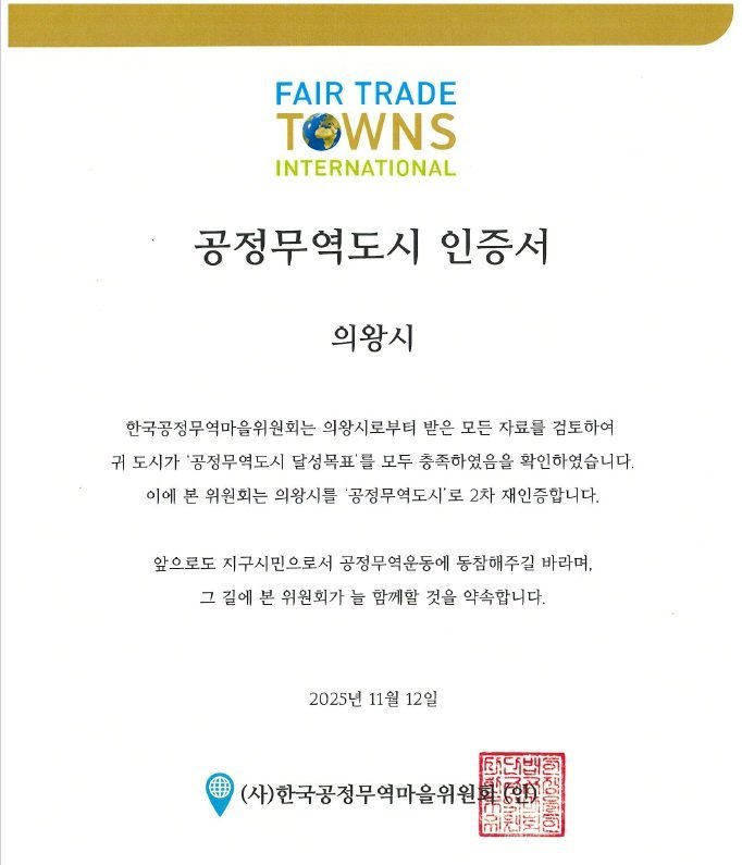 [금요저널] 의왕시가 한국공정무역마을위원회로부터 공정무역도시 2차 재인증을 획득했다.