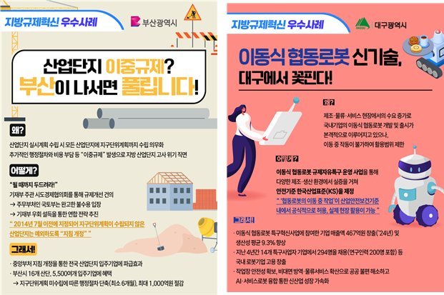 특히, 올해는 지방정부의 신산업 육성 등 관련 산업 관심 제고를 위해 각 지방정부에 신사업 규제혁신 사례를 적극 발굴해 줄 것을 요청한 결과, 총 17건의 우수사례 중 로봇산업, 수직농장 산업, 전기차 보급 등 신산업 지방규제 혁신 우수사례 6건이 선정됐다.