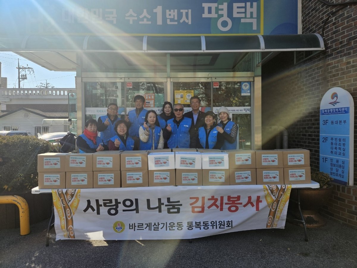 [금요저널] 평택시 통복동 바르게살기위원회는 지난 20일과 21일 이틀간 ‘사랑의 김장 나눔’행사를 개최하고 관내 취약계층에 김장 김치 150㎏을 전달했다.