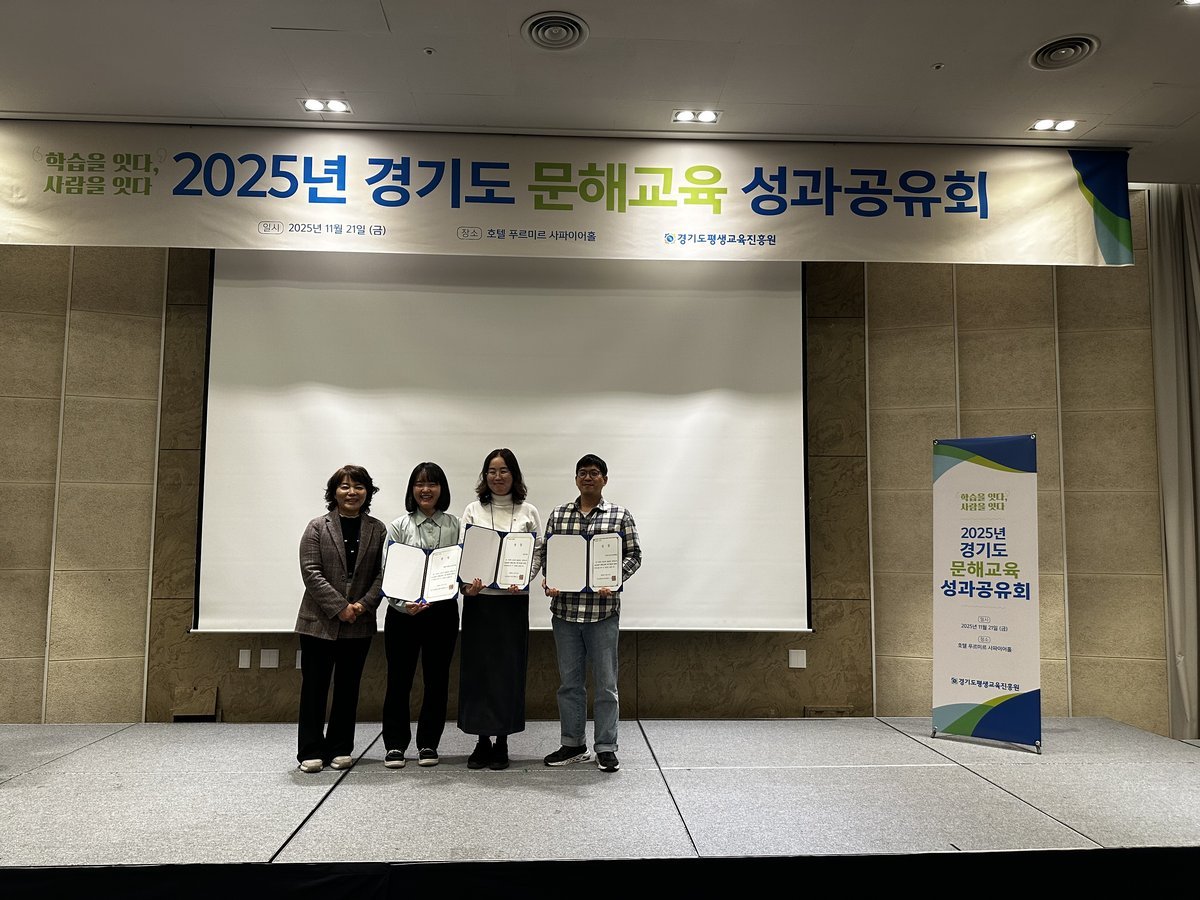 [금요저널] 이천시는 11월 21일 화성시 호텔 푸르미르에서 열린 ‘2025년 경기도 문해교육 성과공유회’에서 경기도평생학습진흥원장상을 수상했다고 밝혔다.