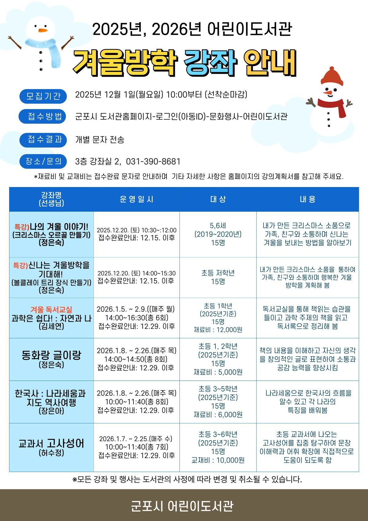 12월 20일 크리스마스 맞이 특강을 시작으로 겨울 독서교실과 여러 분야의 강좌가 마련돼 어린이들의 독서 습관 형성과 지식 탐구를 돕는다.