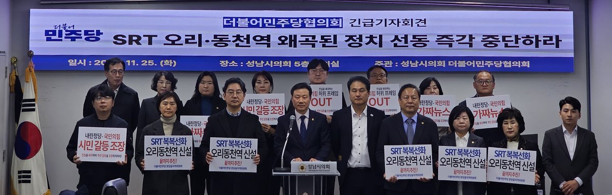 [금요저널] 성남시의회 더불어민주당협의회는 25일 긴급 기자회견을 열고 SRT 오리·동천역 신설과 관련해 사실을 왜곡한 국민의힘의 정치공세가 조직적으로 확산되고 있다며 강력 규탄했다.