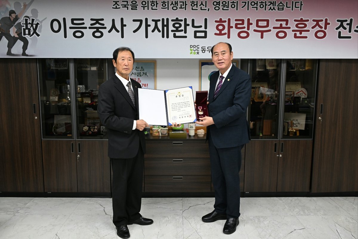 [금요저널] 동두천시는 지난 27일 시청 시장실에서 6·25전쟁 당시 금화지구 전투에서 전사한 가재환 이등중사에게 화랑무공훈장을 추서하고, 그 공적을 기리기 위한 전수식을 개최했다.