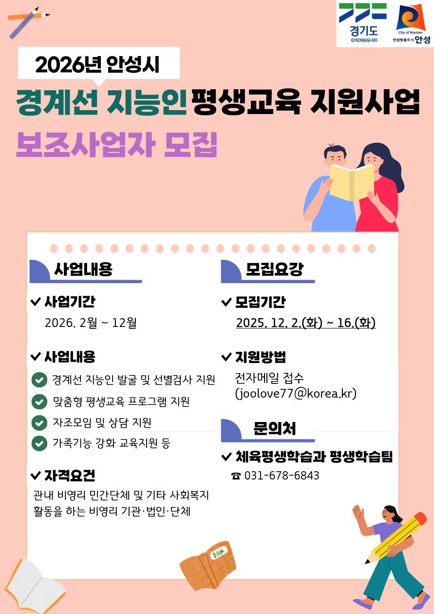 [금요저널] 안성시는 관내 경계선 지능인의 진단·학습·가족 지원을 체계화하고 포용적 학습환경을 조성하기 위해 12월 2일부터 16일까지「2026년 경계선 지능인 평생교육 지원사업」을 수행할 보조사업자를 공모한다.