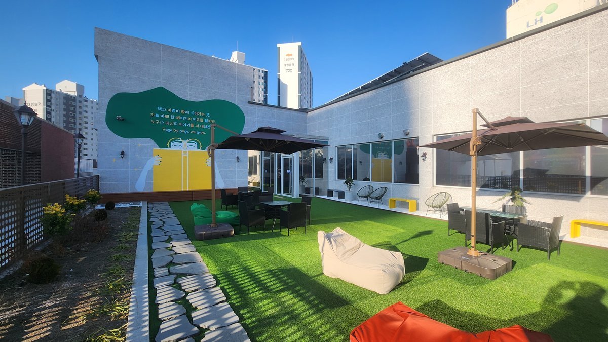산본도서관 3층 옥상은 기존 유휴 공간을 활용해 야외 테이블 세트, 인조잔디, 목재 데크, 소규모 정원, 빈백 등 편안한 휴게시설을 갖춘 복합 힐링 공간으로 재정비되었다.
