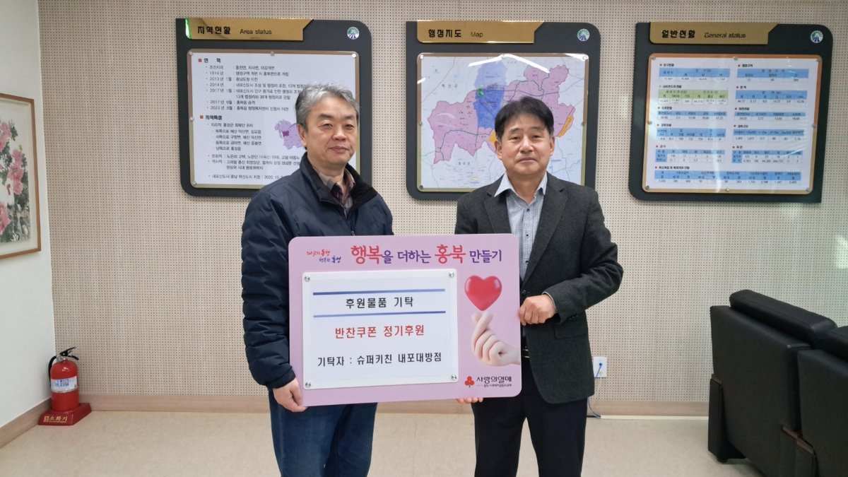 [금요저널] 홍성군 홍북읍은 지난 2일, 슈퍼키친 내포대방점이 관내 저소득층을 지원하기 위해 2만원 반찬쿠폰 120매를 기탁했다고 밝혔다.