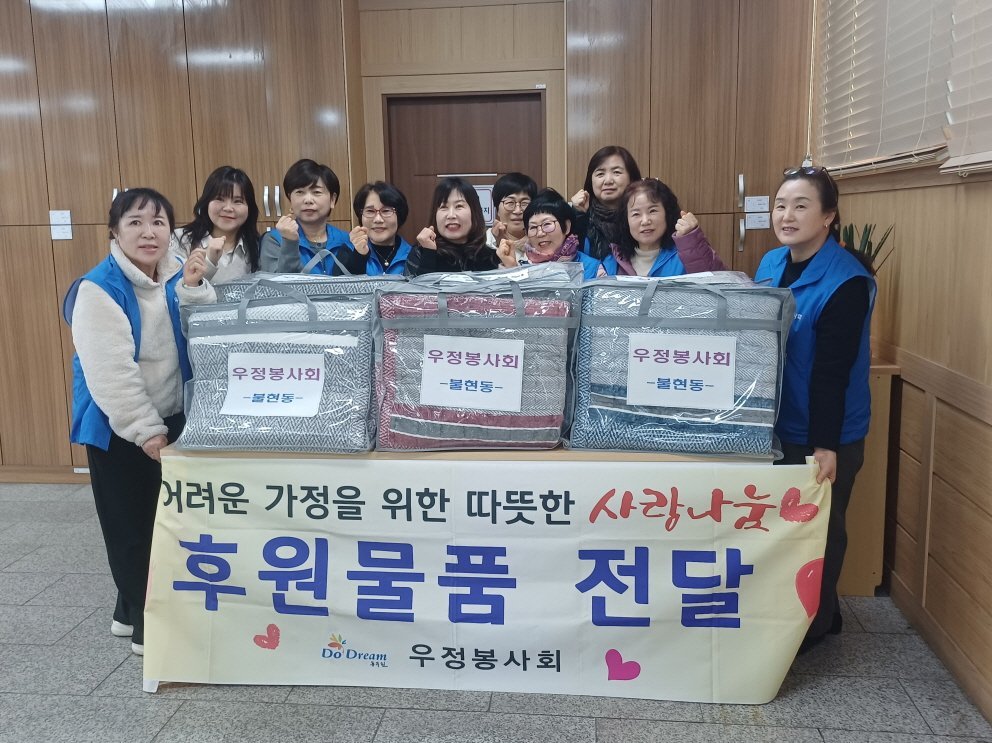 김영미 불현동장은 “평소에도 나눔과 봉사를 지속적으로 실천해 주시는 우정봉사회와 후원자께 감사드린다”라며 “전달된 이불이 어려운 이웃들이 겨울을 따뜻하게 보내는 데 실질적인 도움이 되었길 바란다”라고 밝혔다.
