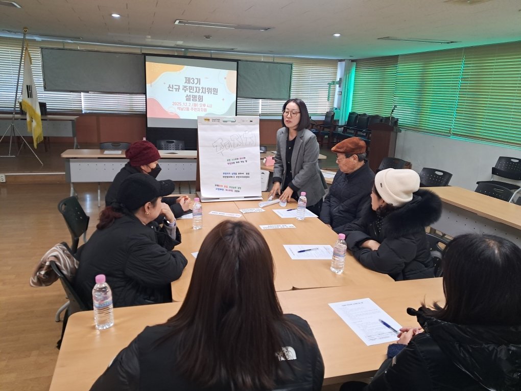 2026년도 제3기 주민자치회 구성을 위한 공개모집 결과 총 26명의 신청자 중에서 신규자는 6명으로 제3기 주민자치회 위원 위촉 전에 중단없는 주민자치회 운영을 위해 주민자치회의 개념, 구성과 기능, 마을 내 역할과 기대 사항 등 기본적인 이론 교육을 실시하였다.