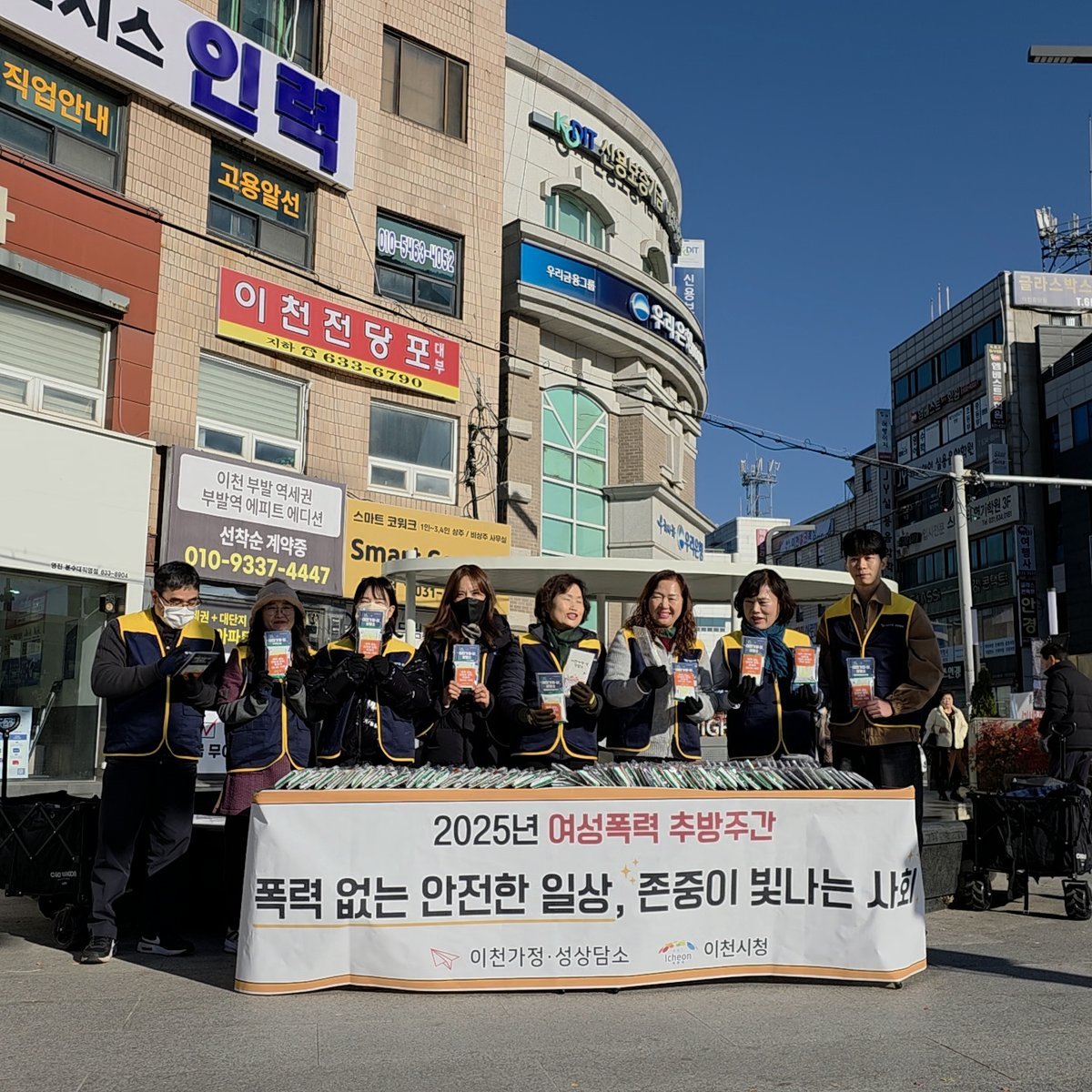 [금요저널] 이천시는 지난 1일 분수대오거리 광장 일원에서 2025년 여성 폭력 추방 주간을 맞아 이천가정·성상담소, 행복나르샤봉사단과 함께 여성폭력 근절 캠페인을 전개했다고 밝혔다.
