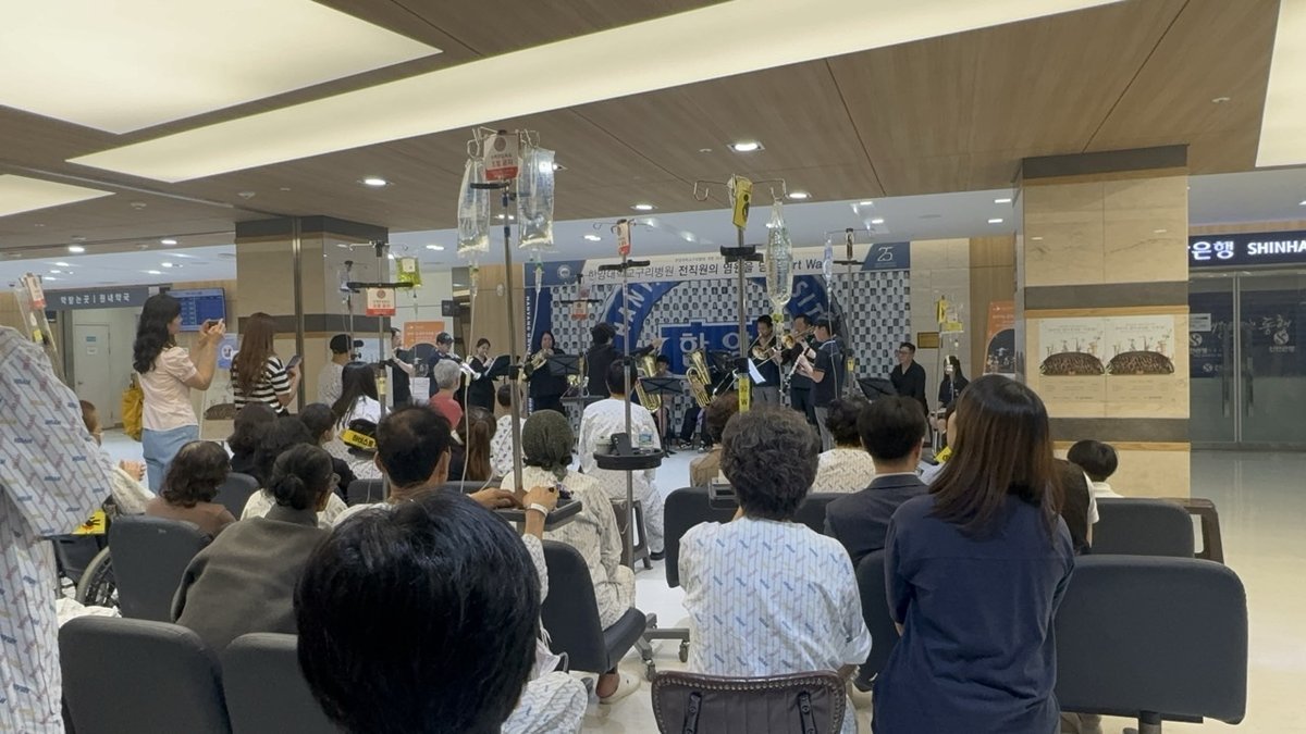 △ [찾아가는 꿈의 앙상블-사계] 꿈의 오케스트라 구리 청소년 단원들이 한양대학교 구리병원 로비에서 재능 나눔 공연을 개최하고 있다.