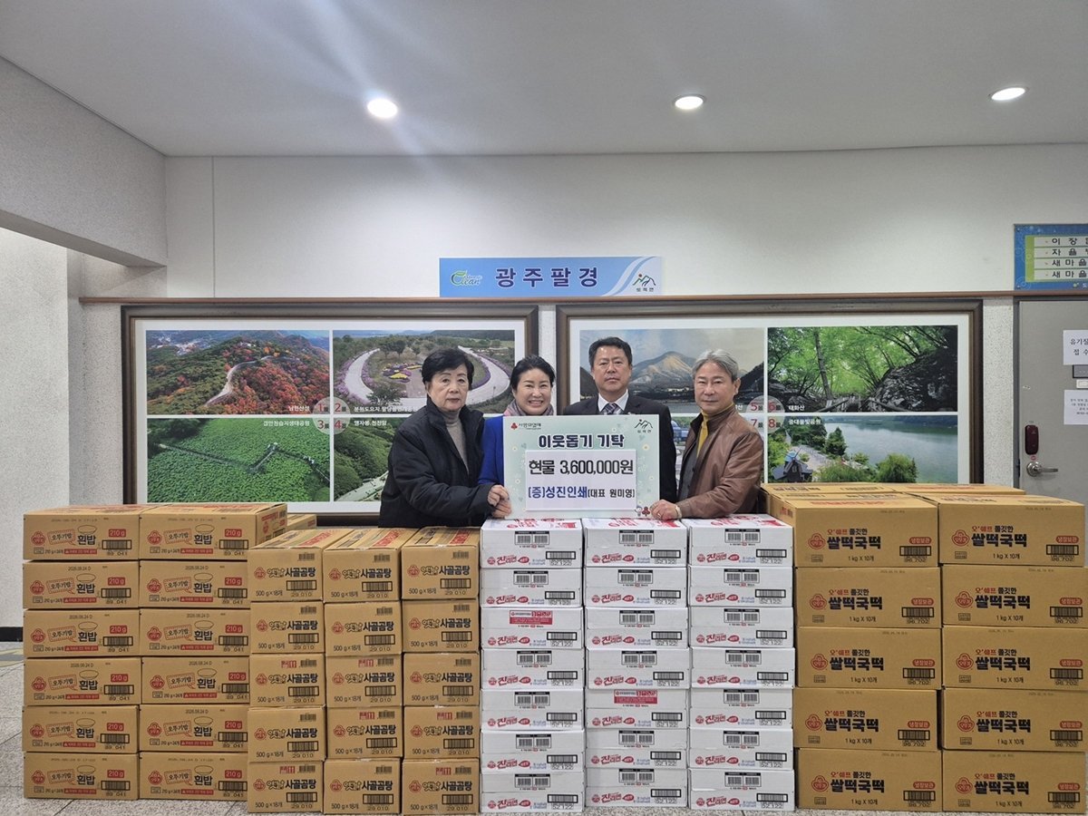 [금요저널] 성진인쇄는 지난 3일 연말을 맞아 광주시 도척면을 방문해 라면, 즉석밥, 떡 등 360만 원 상당의 물품을 기탁하며 온정을 전했다.