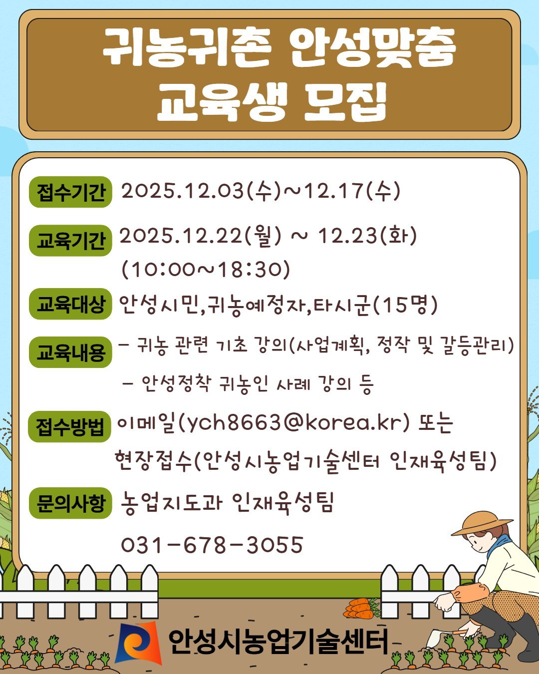 서동남 과장은 “귀농을 고민하는 분들이 사전 정보 부족과 갈등, 제도 이해의 어려움을 해소하고 안성에 안정적으로 정착할 수 있도록 실질적인 도움을 드리겠다”고 말했다.