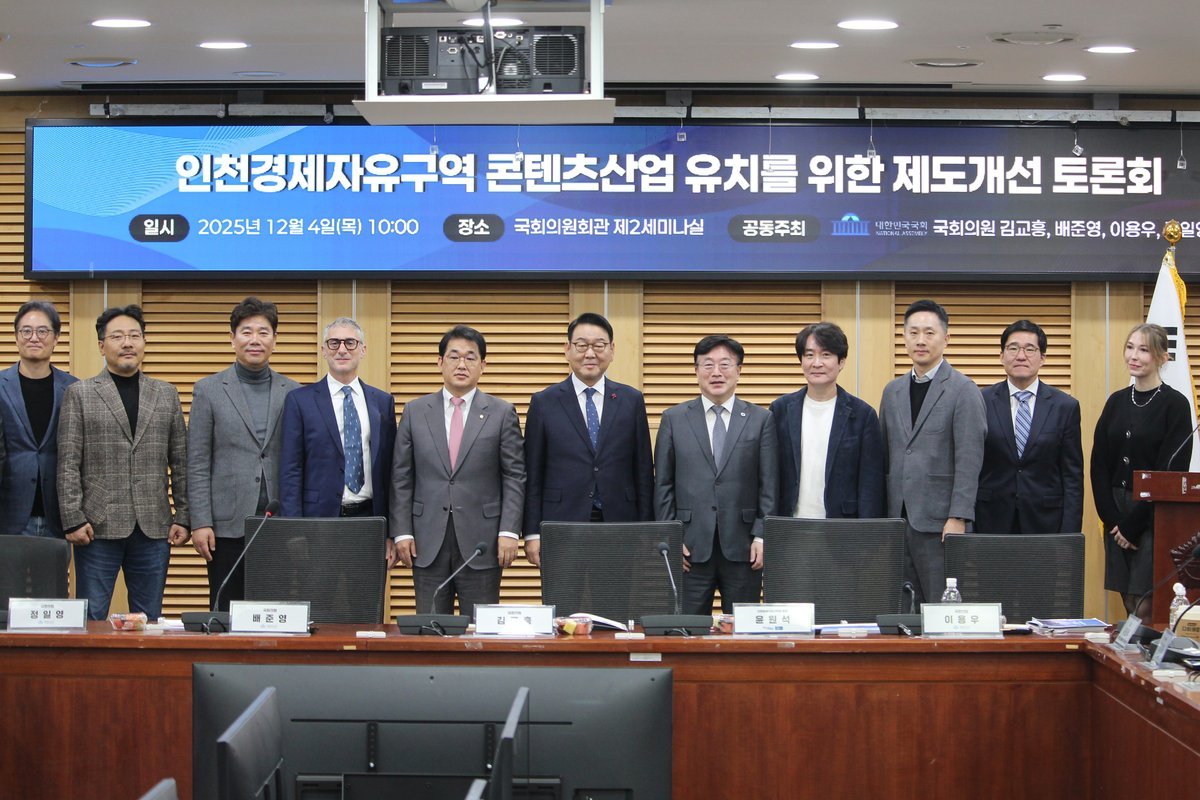 [금요저널] 더불어민주당 국회 문화체육관광위원장 김교흥 국회의원은 4일 국회의원회관 제2세미나실에서 배준영 의원, 이용우 의원, 정일영 의원과 함께 ‘인천경제자유구역 콘텐츠산업 유치를 위한 제도개선’토론회를 열었다고 밝혔다.