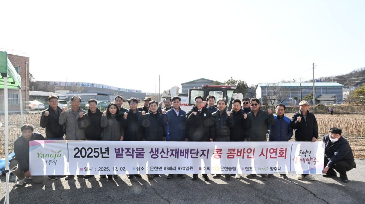 [금요저널] 양주시가 지난 2일 은현면 하패리에서 은현농협 조합원 20여 명과 함께 ‘2025년 밭작물 생산·재배단지 조성사업 콩 콤바인 시연회'를 열었다.