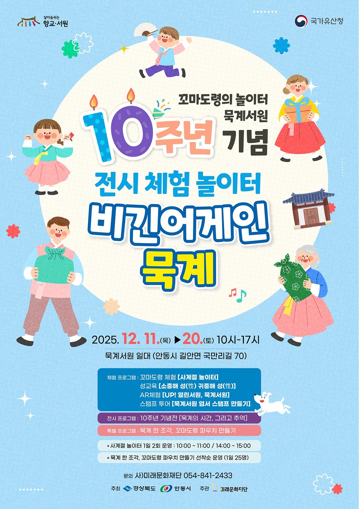 향교․서원 국가유산 활용사업의 일환으로 운영되는 「꼬마도령의 놀이터 묵계서원」은 국가유산청, 경상북도, 안동시가 주최하고 미래문화재단이 주관하는 어린이 특화 문화 체험 프로그램으로, 올해 10년 차를 맞았다.
