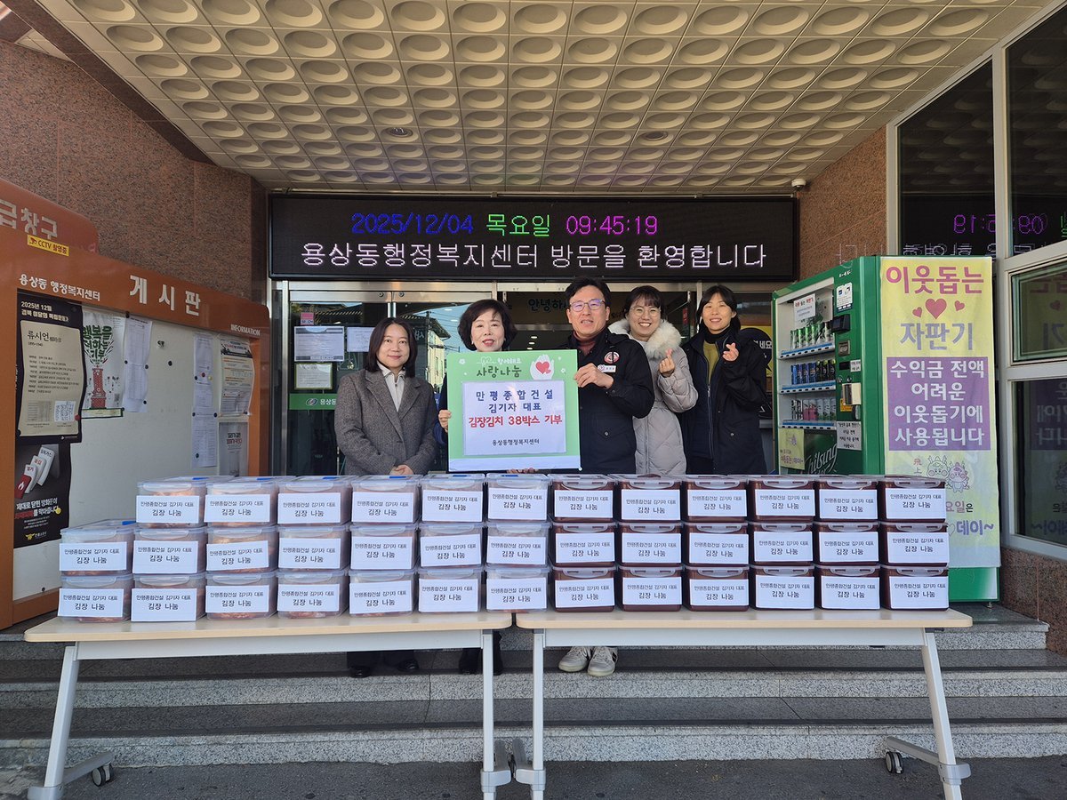 [금요저널] 안동시 용상동 만평종합건설은 4일 연말을 맞아 지역민들과 온정을 나누고자 용상동행정복지센터를 방문해, 직접 담근 김장 김치 38박스를 관내 경로당 38개소에 기부했다.