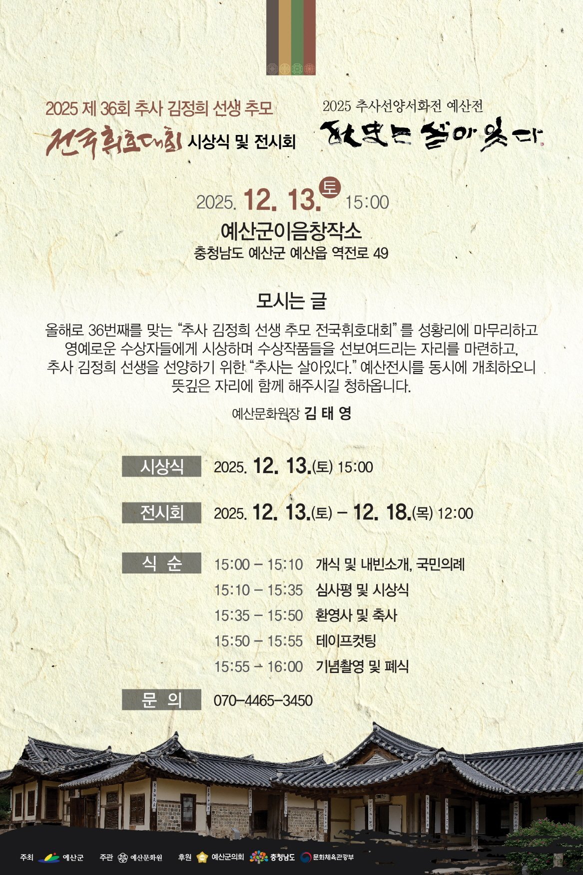 [금요저널] 예산문화원은 지난 10월 11일 개최된 ‘제36회 추사김정희선생 추모 전국휘호대회’시상식을 오는 12월 13일 예산군 이음창작소에서 진행한다고 밝혔다.